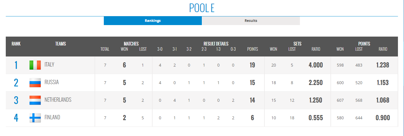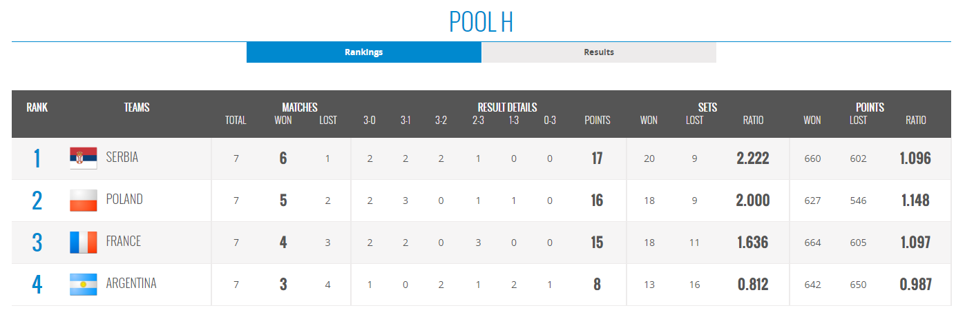 Servië won gisteren met 3-0 van Argentinië en staat daarmee op dit moment eerste in Poule H met 17 punten. Polen, dat met 1-3 verloor van Frankrijk, staat tweede met 16 punten. De Fransen staan derde met 15 punten en maken theoretisch nog steeds kans op een plek bij de laatste zes. Dan zal het vandaag wel tegen Argentinië moeten winnen. De Serven zijn, wat er ook gebeurt, door. De wedstrijd tussen Servië en Polen gaat om de eerste plek, maar Polen zou als het verliest ook nog derde kunnen worden.