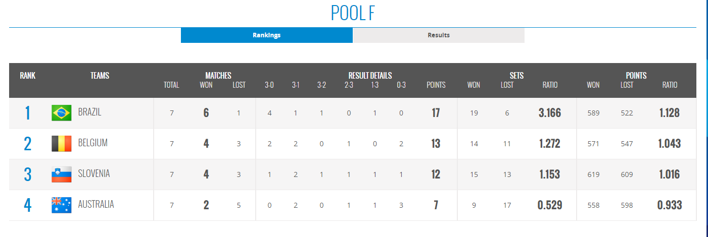 Ook Brazilië is zeker van een plek in de derde ronde. Door de overtuigende winst op Slovenië gisteren, is de Olympisch kampioen niet meer in te halen in Poule F. De Slovenen hebben definitief geen kans meer op het bereiken van de volgende ronde.