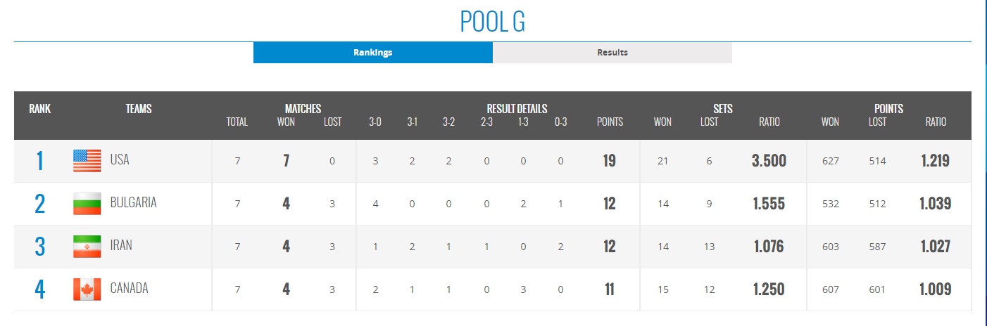 In diezelfde poule heeft Canada in vijf sets gewonnen van Iran. Door de Canadese zege zijn beide teams niet meer in de race voor een plek bij de laatste zes.