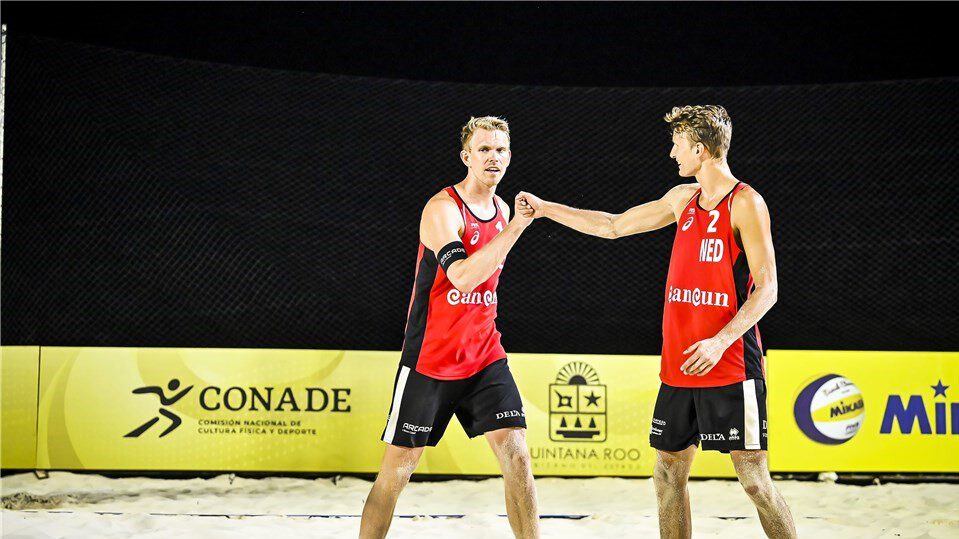 Yorick de Groot en Stefan Boermans presteerden geweldig in het vorige event (vijfde) en wisten zich ook nu voor het hoofdtoernooi te plaatsen. In Poule D trad het af tegen Fijalek/Bryl uit Polen (nr. 4 plaatsingslijst). Boermans/De Groot wist in Mexico eerder al tegenstanders van formaat te verslaan en ook dit keer verraste ze een topteam. Via 24-22 en 21-13 was het de verdiende winnaar in de eerste poulewedstrijd. In de tweede wedstrijd trof het Pedlow/Schachter, dat knap van Bourne/Crabb had gewonnen. De Canadezen wonnen de eerste set (20-22), maar de fitte Boermans en De Groot sleepte er een derde set uit (21-18). Hierin ging het mooi gelijk op. Op 14-13 dacht Canada er goed aan te doen om vóór de service van De Groot een time-out te nemen. Maar Yorick liet zich niet gek maken en serveerde precies tussen de Canadese mannen in. Deze ace bezorgde hen de set- en poulewinst, waardoor Boemans en De Groot al zeker zijn van een top 10-klassering. Kunnen ze de prachtige vijfde plaats van vorige week evenaren? Ze zijn in ieder geval knap op weg.