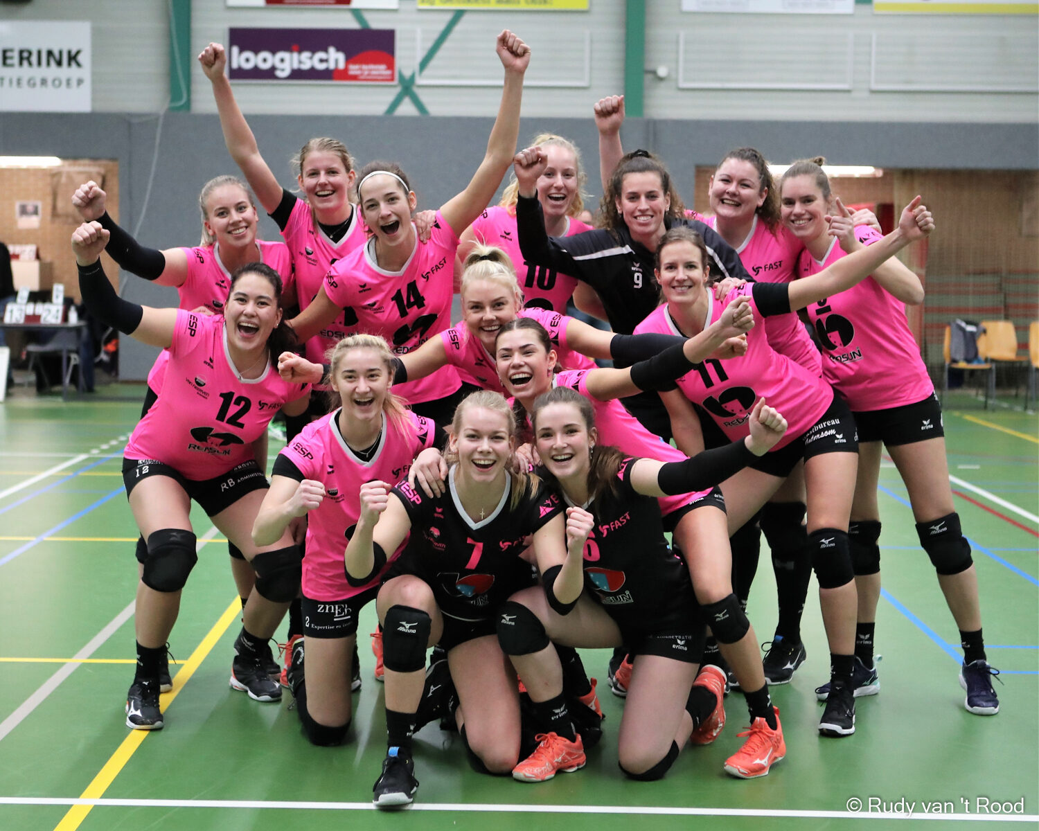 De Ootmarsumse ploeg wist ook de eerste set te winnen (26-24), maar onder aanvoering van Lara Hendricks en Maus Smeets kwam FAST met ruime cijfers weer langszij (11-25). De derde set bleek cruciaal, waarin FAST op ruime voorsprong stond. Set-Up '65 maakte een knappe comeback tot 22-22, maar moest alsnog de set aan de bezoekers laten (23-25). Dat betekende voor de thuisploeg de genadeklap, want ook in set vier was FAST veel sterker (13-25) en pakte het team van Ivo Martinovic daarmee de eerste zege. Smeets werd topscoorder (18 punten), terwijl ook Hendricks (16 punten) en Jorieke Bodde (12 punten) in de dubbele cijfers scoorden.