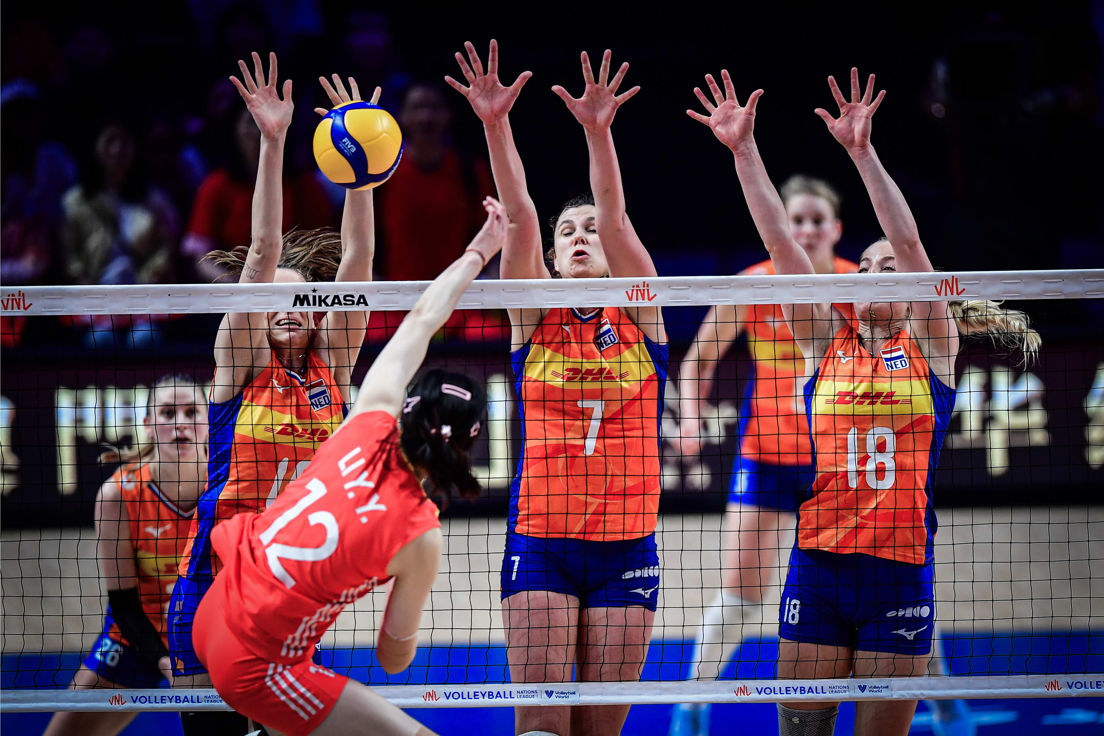 In set twee ging het in eerste instantie gelijk op, totdat China een klein gaatje wist te slaan. Het was Dambrink die haar team bij de hand nam en Oranje weer op gelijke hoogte bracht, dankzij maar liefst negen scores in deze set. Bij de ‘big points’ was Nederland echter net niet scherp genoeg en ging de set alsnog met minimaal verschil naar het thuisland (25-23). Jolien Knollema startte vanaf de derde set voor de onzichtbare Daalderop. In eerste instantie waren de teams aan elkaar gewaagd, maar langzamerhand trok China het initiatief naar zich toe. Daardoor leek de Chinese ploeg snel op weg naar setwinst, maar dat was buiten de servicereeks van Baijens gerekend. Met onder meer twee aces op rij hielp ze Nederland om weer op gelijke hoogte te komen. Inmiddels was ook Van Aalen binnen de lijnen gekomen voor Oranje, maar na opnieuw een spannend slot was het Chinese aanvoerster Xinyue Yuan die de set binnen sloeg voor China (25-23).