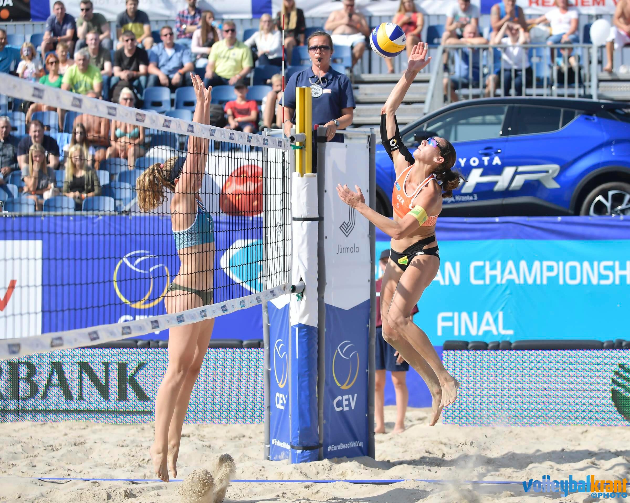 In de openingsset en eerste helft van de tweede set gaven de Nederlandse vrouwen weinig cadeau. De Duitse ervaring was voldoende om de eerste set nipt te winnen (20-22) en een beslissend gaatje te slaan in de tweede doorgang (15-21).
