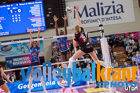 Novara moest voor de 3000 toeschouwers nog wel behoorlijk aan de bak om zich Busto Arsizio van het lijf te houden. De 1ste set werd met 30-28 nipt binnengehaald. Op 26-27 kregen de bezoekers zelfs een setpoint. De 2e en 3e set gingen met 25-18 en 25-21 een stuk makkelijker. Celeste Plak kreeg bij Novara, de nummer 2 op de ranglijst, geen speeltijd. Grote uitblinker bij Novara was zoals gebruikelijk Paola Egonu, met 26 punten. Floortje Meijners begon bij Busto Arsizio aan de kant maar werd in de 1ste set ingebracht. Ze liet een sterke invalbeurt zien en bleef de rest van de wedstrijd staan. Ze scoorde de meeste punten (17) voor haar ploeg.