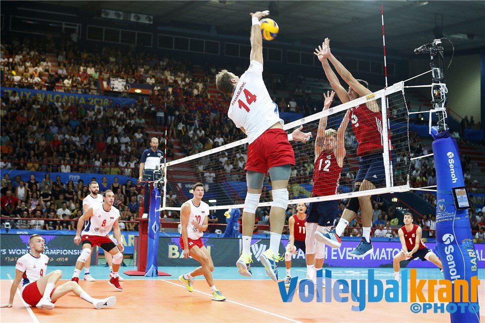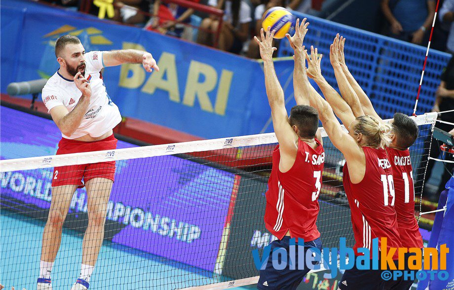 De eerste topwedstrijd in poule C, tussen de Verenigde Staten en Servië, draaide uit op een vijfsetter. In een hoogstaande wedstijd, die meer dan twee uur duurde, trokken de Amerikanen aan het langste eind. Van de twaalf spelers die in de eerste set op het veld stonden, spelen er zeven in de huidige Italiaanse competitie. In set 1 was Servië de baas, met de linkshandige Uros Kovacevic en Aleksandar Atanasijevic als belangrijke aanvallers. In set 2 waren de rollen omgedraaid en leken de Serven het kwijt te zijn. De derde set ging gelijker op, maar Servië wist op een 2-1 voorsprong te komen. Amerika nam het initiatief weer in handen en trok de stand, dankzij de uitstekend spelende Aaron Russell, gelijk. In de beslissende tiebreak wisten de Amerikanen te domineren en de winst binnen te slepen. (15-25, 25-14, 21-25, 25-20, 15-10)