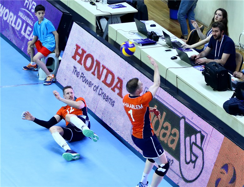 De openinsset tussen Nederland en Slowakije ging gelijk op. Van Haarlem, van Dijk, Diefenbach, Koelewijn, van Garderen, Rauwerdink en Sparidans vormden de basis van Oranje en tikten de stand van 6-6 aan. Daan van Haarlem toonde zijn inzet onder andere door een bal met de voet te redden en hierdoor kwam Nederland met 12-8 dan eindelijk een mooi aantal punten los. Het mocht niet baten, want hoewel Nederland ook de twintig punten met een voorsprong in ging, zorgden twee uitgeslagen ballen van Rauwerdink en van Dijk er aan het eind van de set voor dat Slowakije de zege pakte met 24-26.