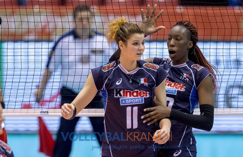 Het sterke Italië heeft vriend en vijand verrast door met de verjongde selectie een goed toernooi neer te zetten. De combinatie van de jonge, onbevangen aanvalsters zoals Paola Egonu (#18) en Miriam Sylla (#16) en ervaren speelsters zoals Cristina Chiricella (#11) en Antonella Del Core (#15) maken het een sterke ploeg. Oranje startte met de bekende basis van Sloëtjes, Buijs, Balkesten-Grothues, Beliën, Steenbergen, Dijkema en Stam-Pilon en kende een onwennige start. Nadat Italië een gaatje had geslagen wist Nederland zich terug te vechten in de wedstrijd. Op de service van Beliën en na blok van Buijs werd een 14-13 voorsprong teruggepakt.
